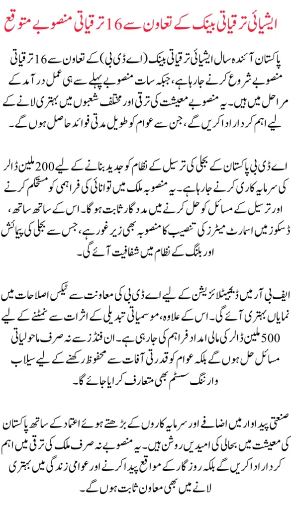 16 Game-Changing Development Projects in Pakistan. Pakistan is going to launch 16 development projects next year with the support of the Asian Development Bank (ADB). Seven projects are already in the implementation phase. These projects will play a significant role in the development of the economy and bring improvements in various sectors, which will bring long-term benefits to the people.