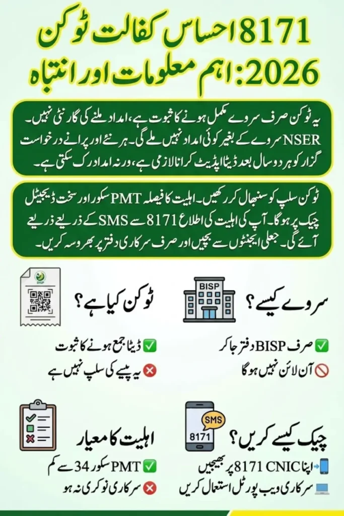 The 8171 Ehsaas Kafalat Token 2026 is an official proof issued after completing the NSER Dynamic Survey at a BISP office. It confirms that household information has been successfully recorded in the national system. The token does not mean payment approval. It only starts the eligibility review process.