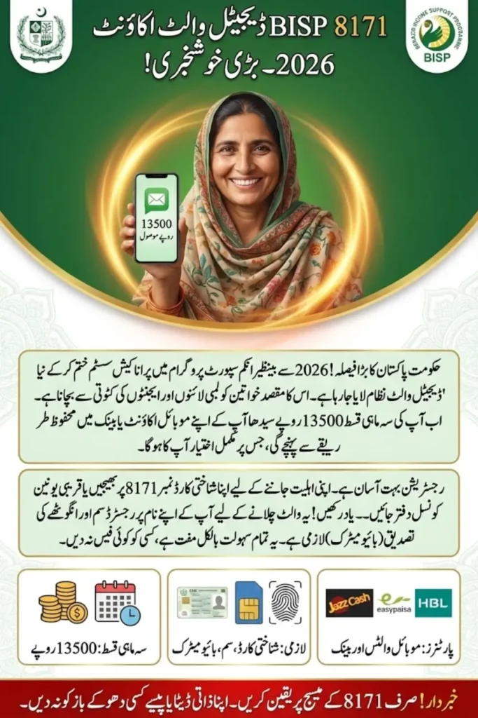 The BISP 8171 Wallet Account Registration 2026 is a major reform in Pakistan’s social welfare system. The government is replacing cash payments with a digital wallet to ensure that financial support reaches deserving families safely and directly. This change mainly supports women by giving them direct control over their assistance.