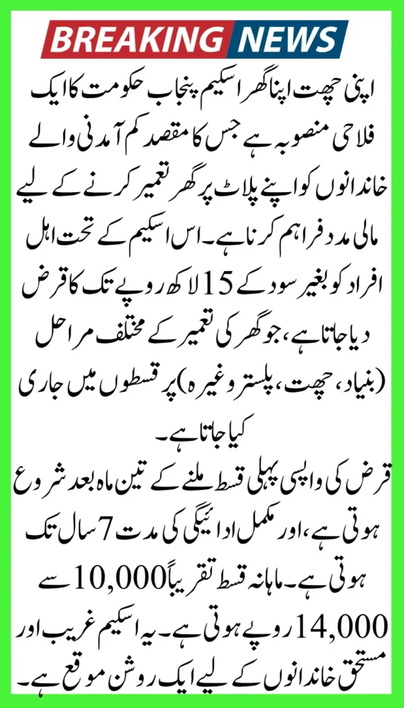 Apna Ghar Apni Chhat Scheme: The Punjab government has launched a major housing scheme for low-income families called the “Apni Chhat Apna Ghar” scheme. The aim of this program is to provide interest-free loans to people who do not have their own house but own land and wish to build a house.