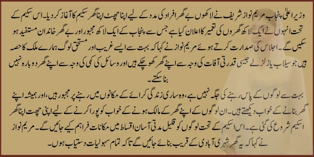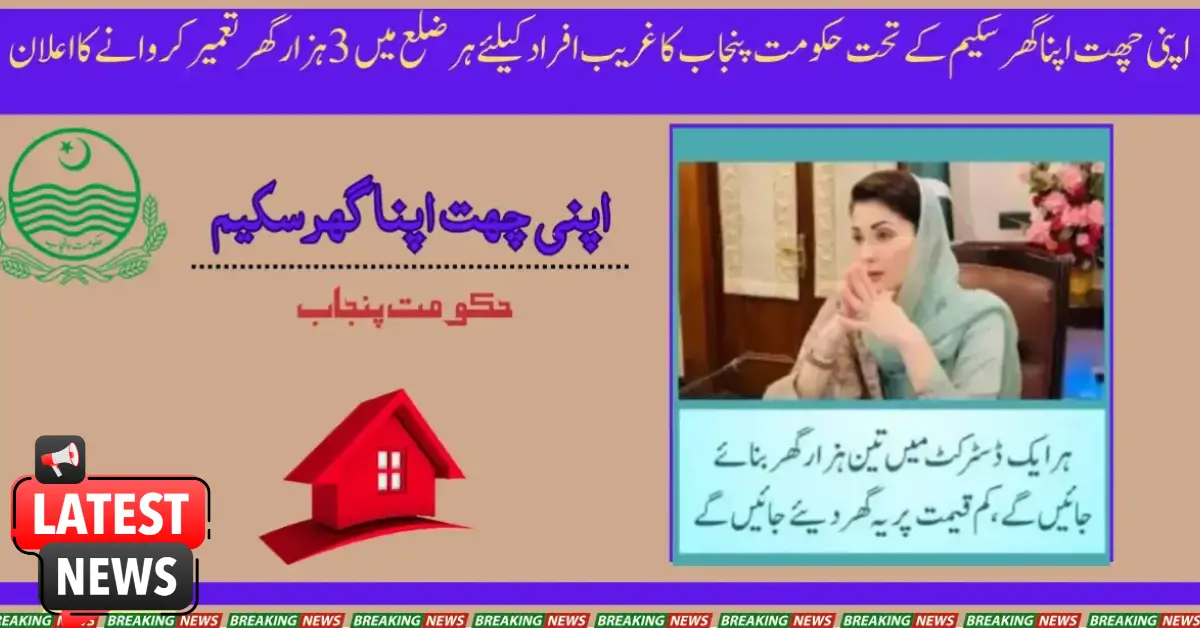 Many people have no place to live, are forced to live in rented houses all their lives, and always dream of building their own houses. The Apni Chhat Apna Ghar scheme has been launched to fulfil the dream of these people to own their own homes. Under this scheme, houses will be provided to people in short-term, easy instalments. Maryam Nawaz said these houses will be built near the urban population to make all the facilities available. Apni Chhat Apna Ghar scheme will provide houses to the poor sections and homeless people.