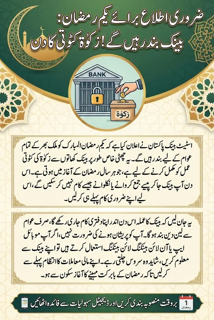 The Bank Holiday on 1st Ramadan-ul-Mubarak 1447 A.H. has officially been announced by the State Bank of Pakistan (SBP). According to the official notification, all banks across the country will remain closed to the public for Zakat deduction on this day.