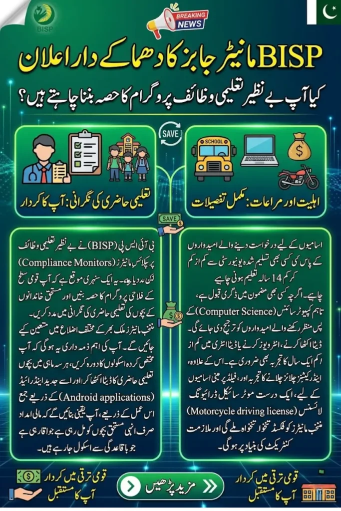 The BISP Compliance Monitor Jobs 2026 provide a valuable opportunity for educated individuals to contribute to a national social welfare initiative. By joining the monitoring team of the Benazir Taleemi Wazaif program, selected candidates will help ensure that educational support reaches deserving students and that attendance compliance is properly maintained.