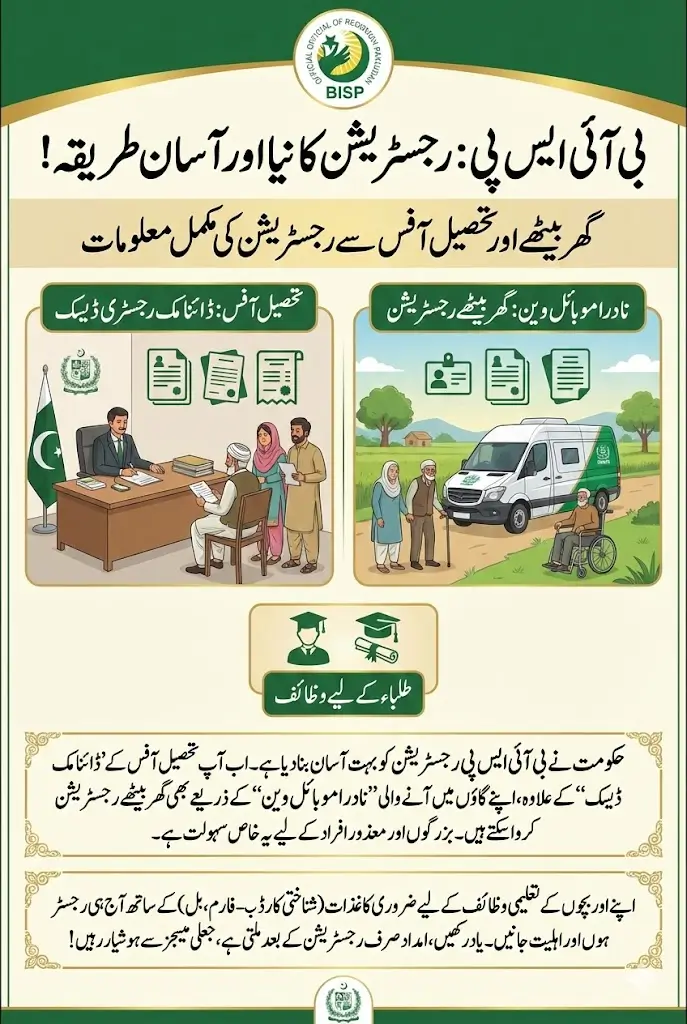 A new method of registering people in the Benazir Income Support Program has been introduced. Through this program, registration services are now being provided to people sitting at home. A Mobile Registration Center has been started by BISP for this purpose.