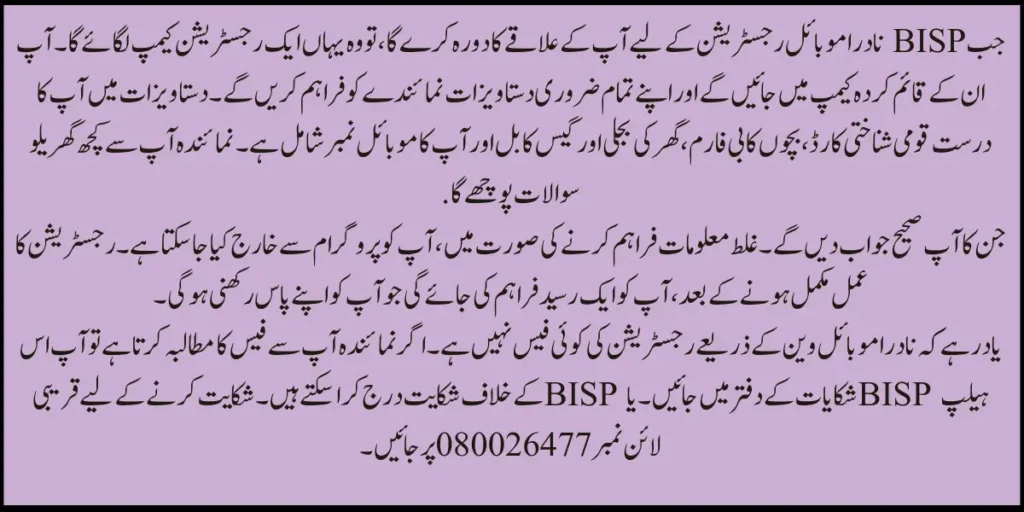 Remember that there is no fee for registration through the Nadra Mobile Van. If the representative demands a fee from you, you can file a complaint against him. Go to the nearest BISP Complaints Office to complain. Or visit the BISP helpline number 080026477.
