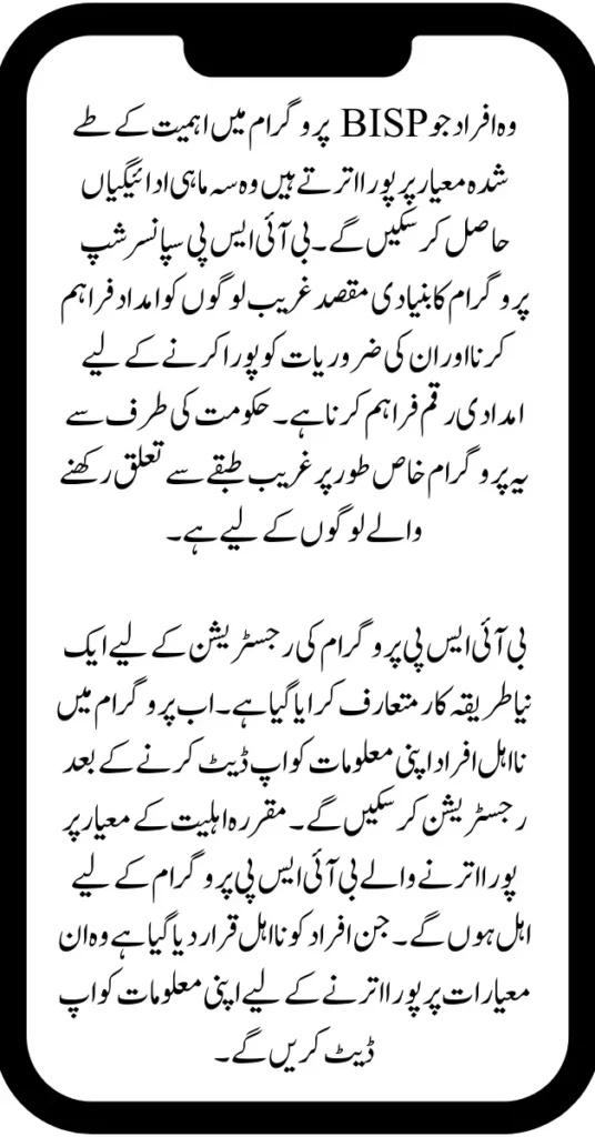 نااہل خاندانوں کی رجسٹریشن کو ان کے نئے طریقہ کار کے طور پر اعلان کیا گیا ہے۔ جو لوگ بی آئی ایس پی پروگرام میں رجسٹر ہونا چاہتے ہیں وہ اپنی معلومات کو اپ ڈیٹ کرنے کے بعد اس طریقے سے رجسٹر ہونے کے اہل ہوں گے۔ بینظیر انکم سپورٹ پروگرام کے تحت، مستفید ہونے والوں کو 13500 روپے کی سہ ماہی ادائیگی سے اپنی ضروریات پوری کریں گے۔
