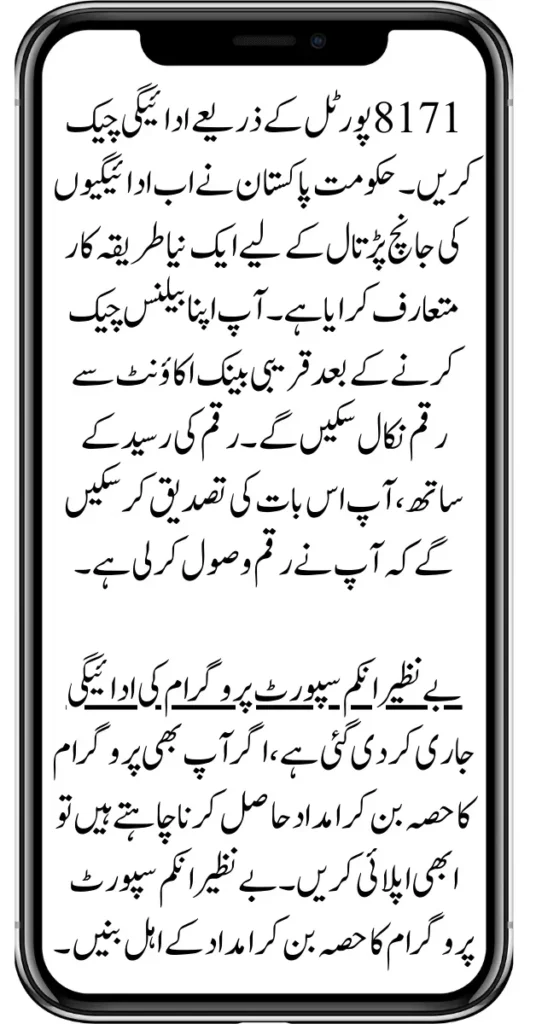 Check payment through the 8171 portal. The Government of Pakistan has now introduced a new mechanism for checking payments. You will be able to withdraw money from the nearest bank account after checking your balance. With the money receipt, you will be able to confirm that you have received the money.