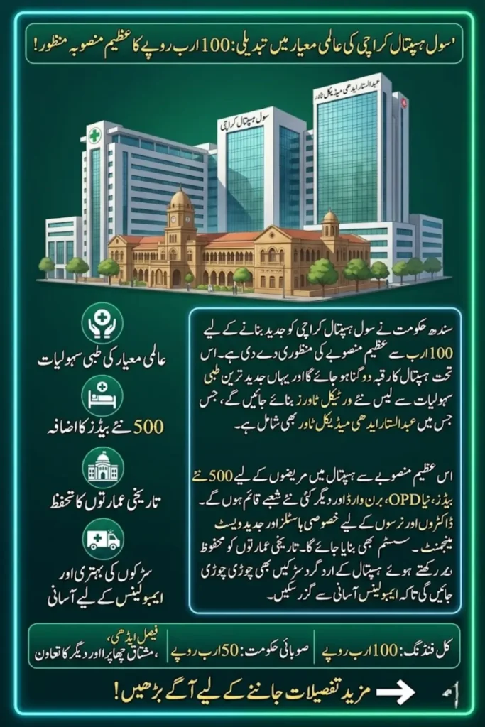 The Civil Hospital Karachi Development Plan has received in-principle approval from the government of Sindh, marking a major step toward improving healthcare infrastructure in Karachi. The plan, worth Rs 100 billion, aims to modernize and expand Civil Hospital Karachi while preserving its historical significance.
