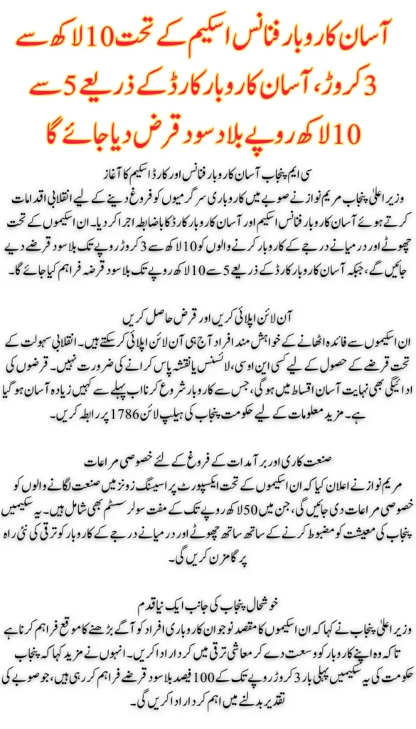 The CM Punjab Asan Karobar Finance Scheme and Asan Karobar Card represent a bold and innovative approach to economic development. By providing interest-free loans, removing bureaucratic hurdles, and supporting SMEs, the Punjab government is laying the groundwork for a prosperous future. Entrepreneurs and business owners now have an unparalleled opportunity to contribute to the province’s economic growth and realize the vision of a thriving Punjab. For more details, individuals are encouraged to contact the helpline 1786 or apply online today.