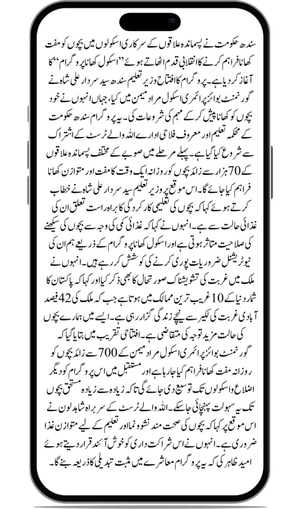 The Chief Minister has launched a free school meal program for children in Sindh. The initiative aims to improve nutrition and support students’ learning and health.