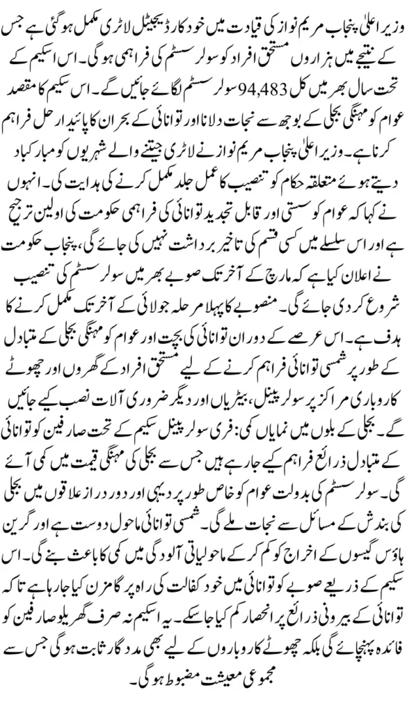 Punjab Chief Minister Maryam Nawaz congratulated the citizens who won the lottery and directed the concerned authorities to complete the installation process soon. She said that providing affordable and renewable energy to the people is the top priority of the government, and no delay will be tolerated in this regard.