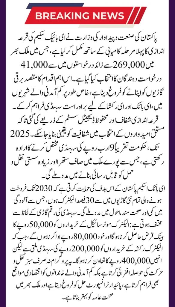 The Ministry of Industries and Production of Pakistan has successfully completed the first phase of the E-Bike Scheme lottery, selecting 41,000 applicants from over 269,000 applications nationwide. This initiative aims to promote the use of electric vehicles (EVs), especially among low-income citizens, by offering direct subsidies to make e-bikes and e-rickshaws more affordable. The transparent and secure digital balloting process ensures fairness in selecting deserving candidates for the subsidies.