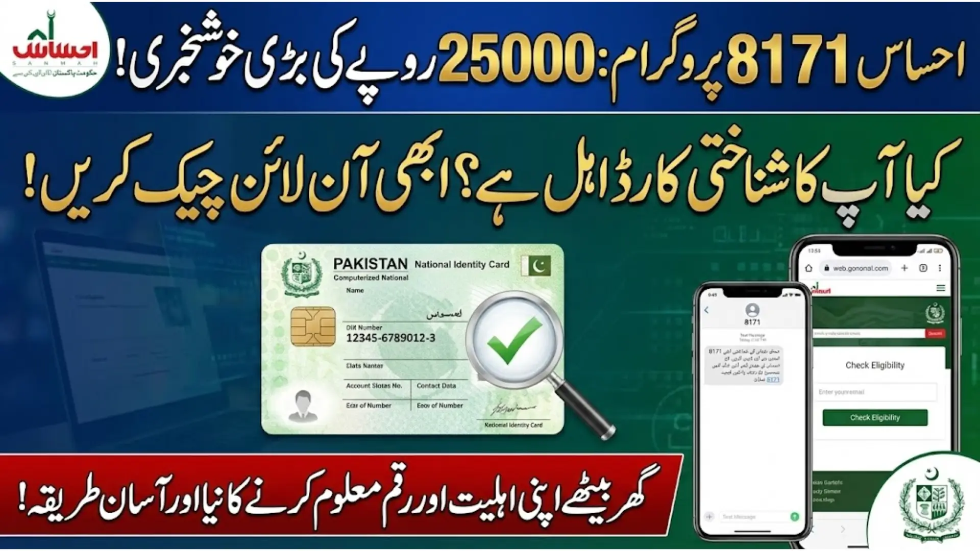 جیسے ہی آپ اپنا شناختی کارڈ نمبر 8171 پر بھیجیں گے۔ آپ کو معلومات کے ساتھ مطلع کیا جائے گا کہ آیا آپ اس پروگرام کے اہل ہیں یا نہیں۔ اگر آپ اپنی اہلیت کو آن لائن چیک کرنا چاہتے ہیں، تو آپ نیچے دیے گئے عنوان میں لکھے گئے مضمون کو پڑھ کر آسانی سے آن لائن چیک کر سکتے ہیں۔