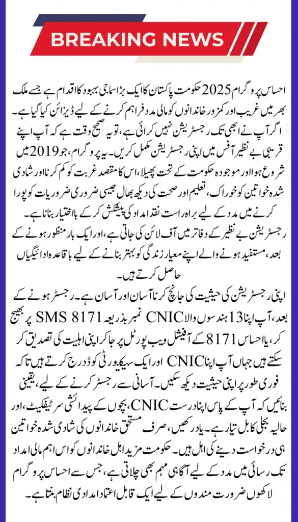 The Ehsaas Programme 2025 continues to be a vital lifeline for millions of poor and deserving families in Pakistan. If you meet the eligibility criteria, don’t miss this opportunity to register at your nearest Benazir office and start receiving the financial aid you deserve. Checking your status online by CNIC through SMS or the official portal makes the process convenient and transparent.