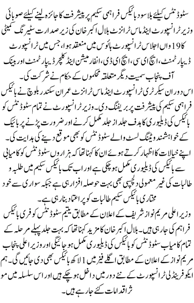 Minister for Transport Bilal Akbar Khan directed all the concerned officers to complete the delivery of bikes as soon as possible so that more students can benefit from this facility. He further directed that the students included in the waiting list should also be provided with bikes as per the requirement so that no student has to be deprived of this facility.