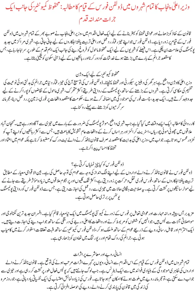 A new update reports that the Chief Minister of Punjab has directed authorities to establish Dolphin Force units in all cities. This move aims to strengthen urban security and ensure faster response to emergencies.