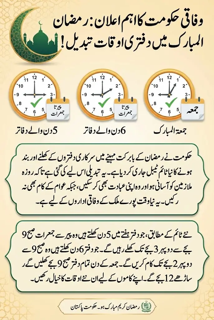 For federal institutions that operate five days a week, the new working hours during Ramadan have been set from 9:00 AM to 3:00 PM, effective from Monday to Jamarat (Thursday).