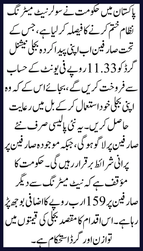 Federal Govt ends Net Metering. Transition from net metering to gross metering. The government plans to implement gross metering for solar consumers by abolishing the traditional net metering system. Under this, consumers will no longer be able to consume the electricity they generate themselves, but will have to sell it to the National Grid at a fixed rate. This proposal will be sent to the federal cabinet after being finalized by Nepra.