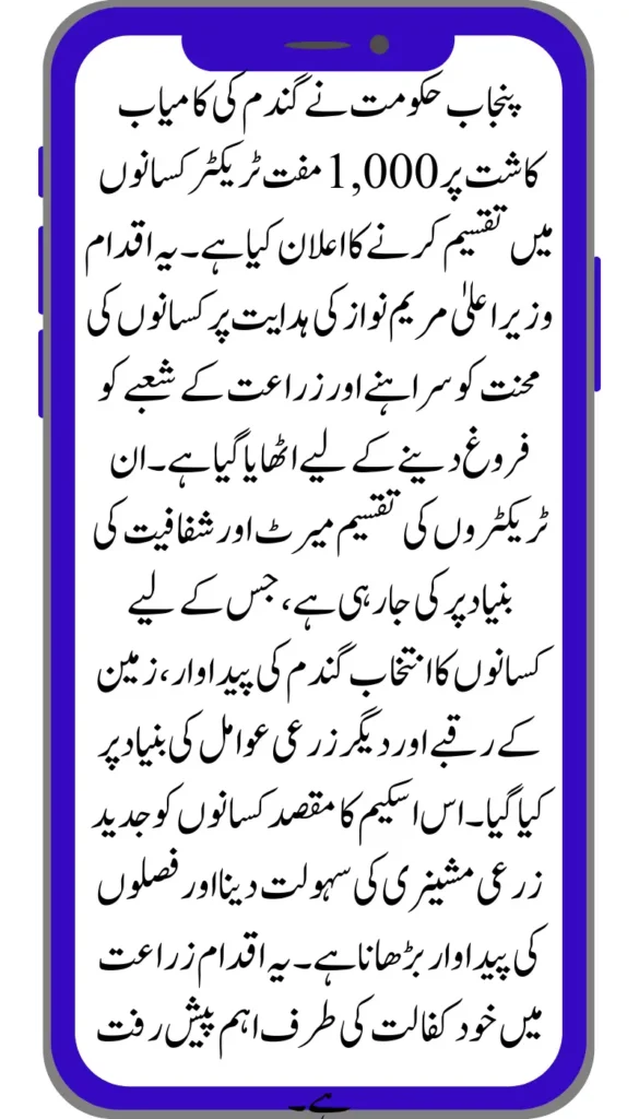 Punjab government has awarded 1,000 free tractors to farmers in recognition of their successful wheat cultivation. The initiative aims to boost agricultural productivity and support mechanized farming across the province.