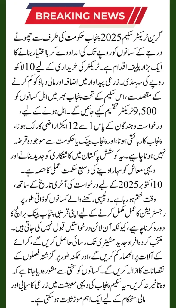 The Green Tractor Scheme is a subsidy-based initiative launched by the Government of Punjab to assist farmers who face financial challenges in improving their agricultural output. Under this scheme, 9,500 tractors will be distributed to eligible farmers at a highly subsidized rate.