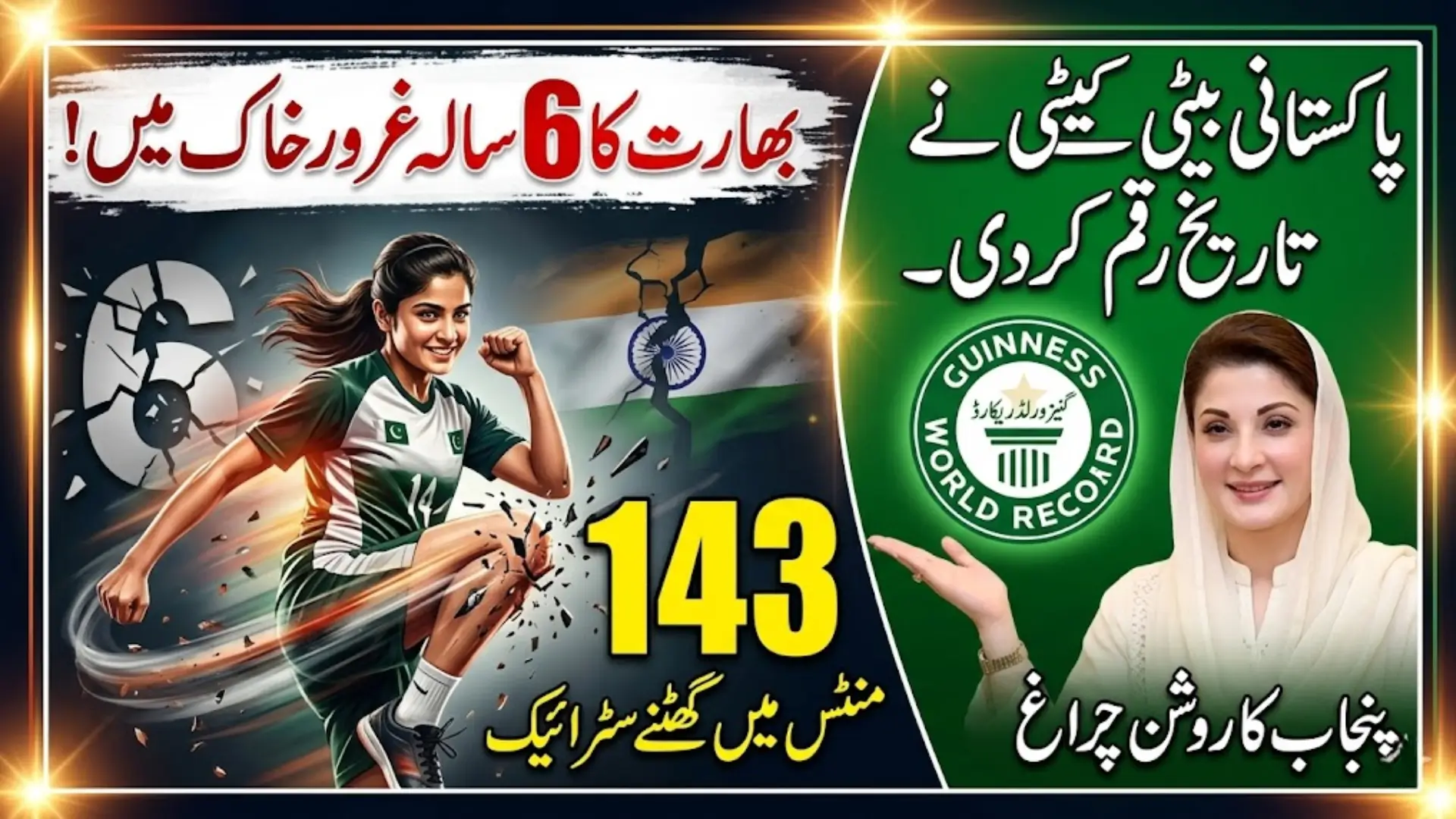 Haram Rehan, a talented athlete from Gujranwala Government College for Women, Satellite Town, has made Pakistan proud by breaking a 6-year-old Indian record in knee strikes. Her outstanding achievement has not only earned her a place in the Guinness Book of World Records but also the heartfelt congratulations of Chief Minister Maryam Nawaz Sharif.