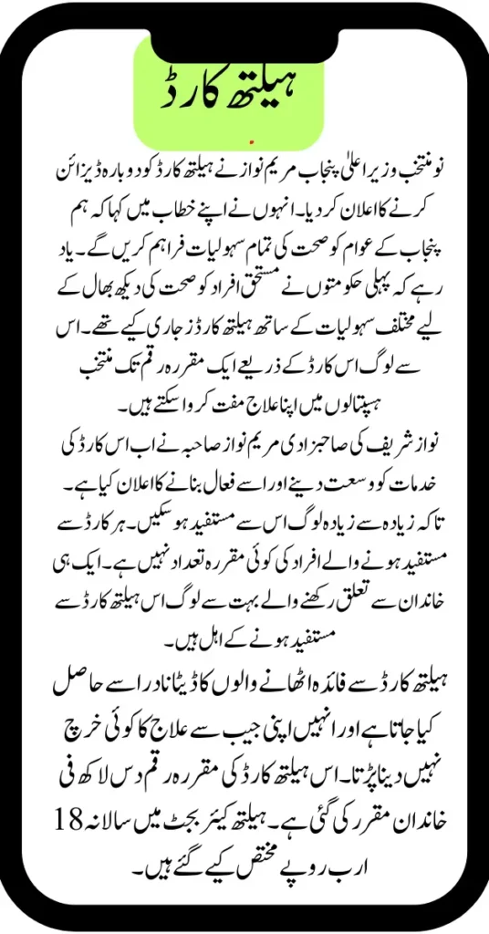 The newly elected Chief Minister of Punjab, Maryam Nawaz, has announced the health card redesign. She said in his address that we will provide all health care facilities to the people of Punjab. It should be remembered that the first governments issued health cards along with various facilities for health care to deserving people. From this, people could get their treatment free of charge in selected hospitals up to a fixed amount through this card.