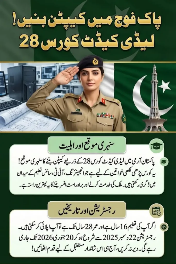 Lady Cadet Course 28 focuses on recruiting skilled females who can contribute to technical, educational, and administrative roles. The program ensures professional growth, leadership training, and a structured military career in Pakistan Army.