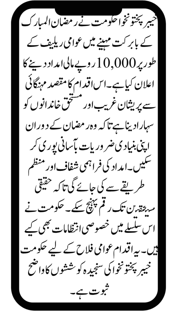KPK Ramazan Aid: Receive Rs 10,000 in Support for Public Relief. The Khyber Pakhtunkhwa government has made an important decision to provide financial assistance to the poor and deserving people during the holy month of Ramadan. The government will offer financial support of Rs 10,000 to the poor and deserving people during the holy month of Ramadan. For this program, 1 million families will benefit from the Khyber Pakhtunkhwa government, and they will be selected from each constituency. I will provide you with all the information in this article and how deserving people can benefit from this program.