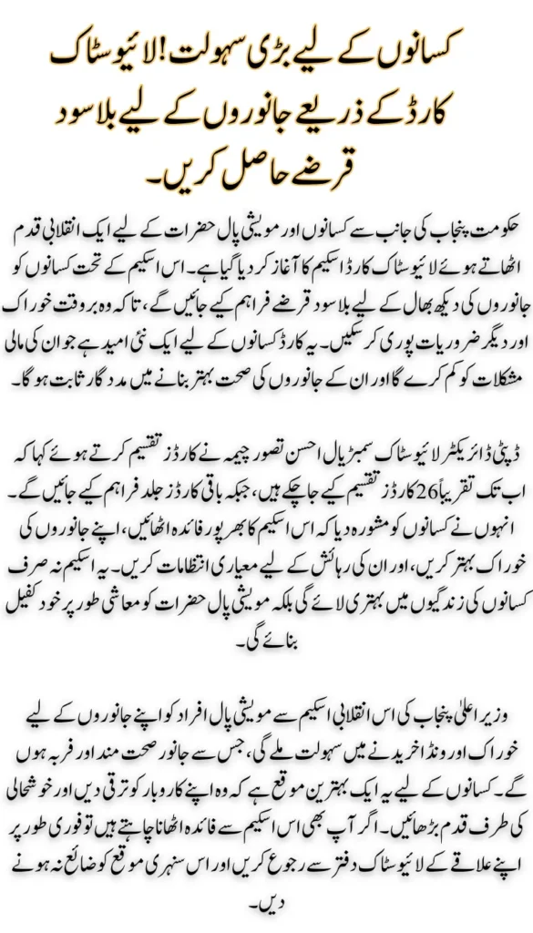 Launches CM Livestock Card under the leadership of Punjab Chief Minister Maryam Nawaz is a revolutionary step, which will prove to be important for the prosperity of farmers and ranchers. Through this card, farmers will be provided with an interest-free loan of up to Rs 27,000 per animal, which will be available for four months. This project aims to strengthen the agriculture and livestock sector and reduce the financial difficulties of farmers.