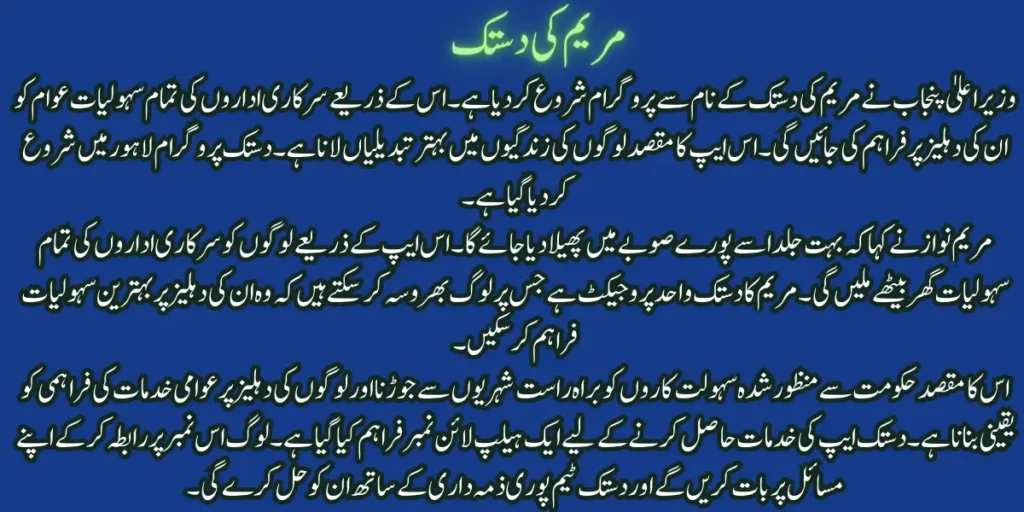 Maryam Ki Dastak is a revolutionary step that is promoting digital governance as well as creating convenience in the daily lives of people. Thanks to this innovative service, now the citizens of Punjab can get their desired government services from the comfort of their homes without any hassle. This project is not only playing an important role in the welfare of the people but is also further strengthening the government’s commitment to transparency and effective governance.