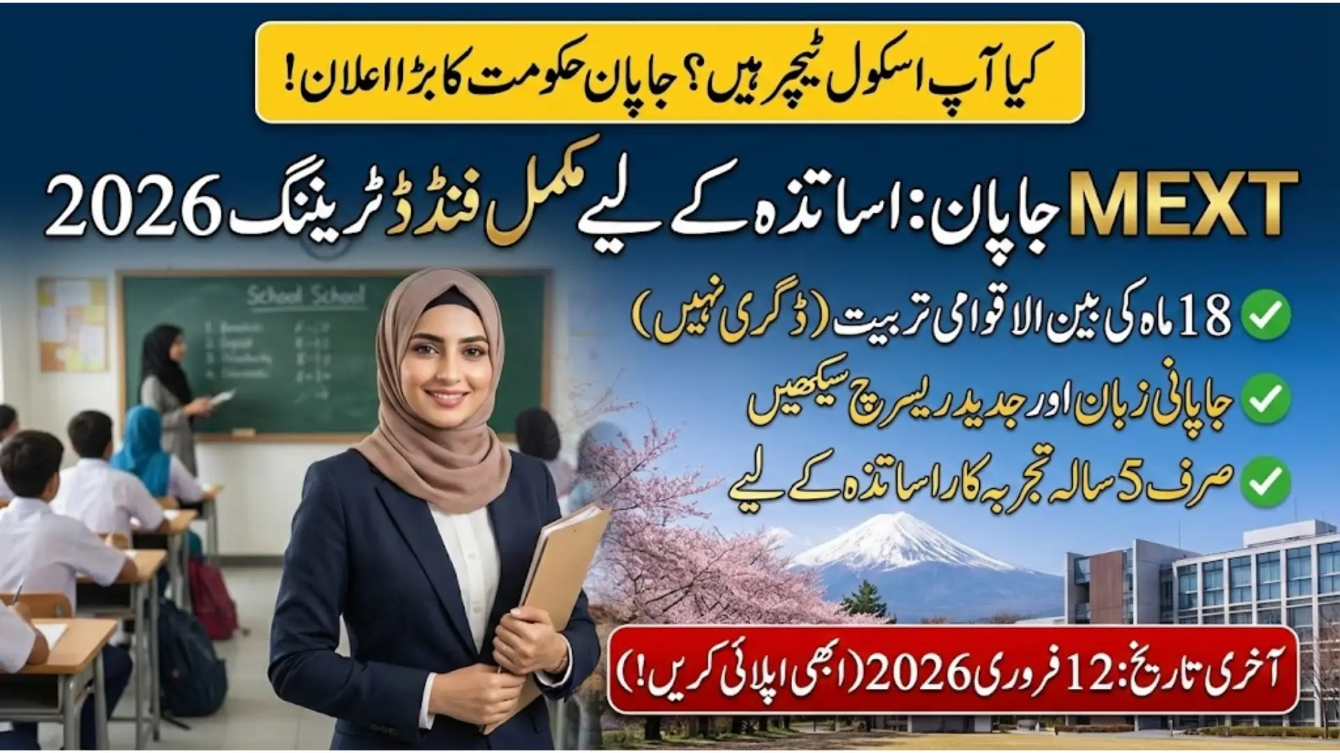 The MEXT Teachers Training Scholarship 2026 is announced by the Government of Japan for Pakistani teachers. It offers a professional opportunity to study school education practices in Japan.