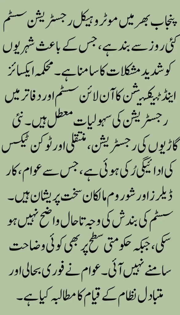 Thousands of citizens have been affected due to the shutdown of this system. Especially those who have bought new vehicles or want to transfer their vehicles to someone else’s name, all their legal matters have come to a standstill. In other cities, including Lahore, Rawalpindi, Faisalabad, Multan, Bahawalpur, Gujranwala, citizens are also forced to visit offices daily.