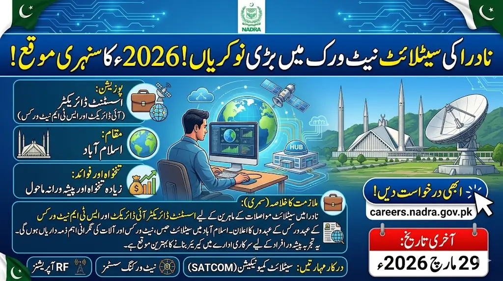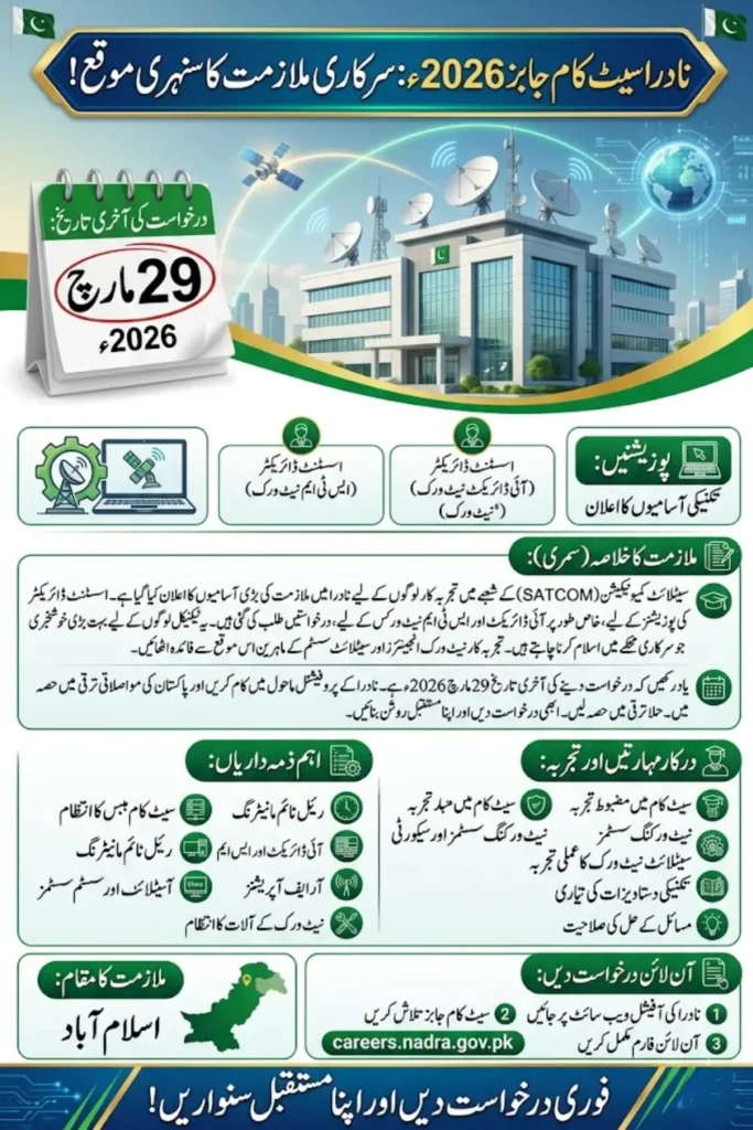 The last date to apply for NADRA SATCOM Jobs 2026 is 29th March 2026. Applicants are advised to submit their applications as early as possible to avoid last-minute problems.
