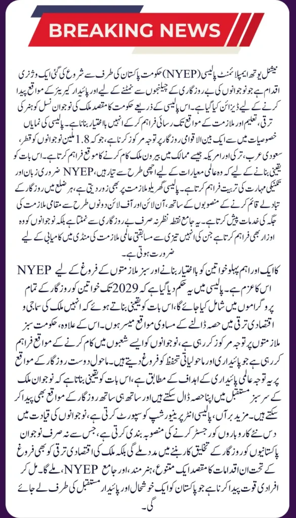 The NYEP is not just about providing jobs it’s about equipping young Pakistanis with the skills, opportunities, and support they need to build successful careers and contribute to the country’s economic and social development. As this policy unfolds, it will play a critical role in shaping the future of Pakistan, ensuring that youth become a central part of the country’s growth and prosperity.