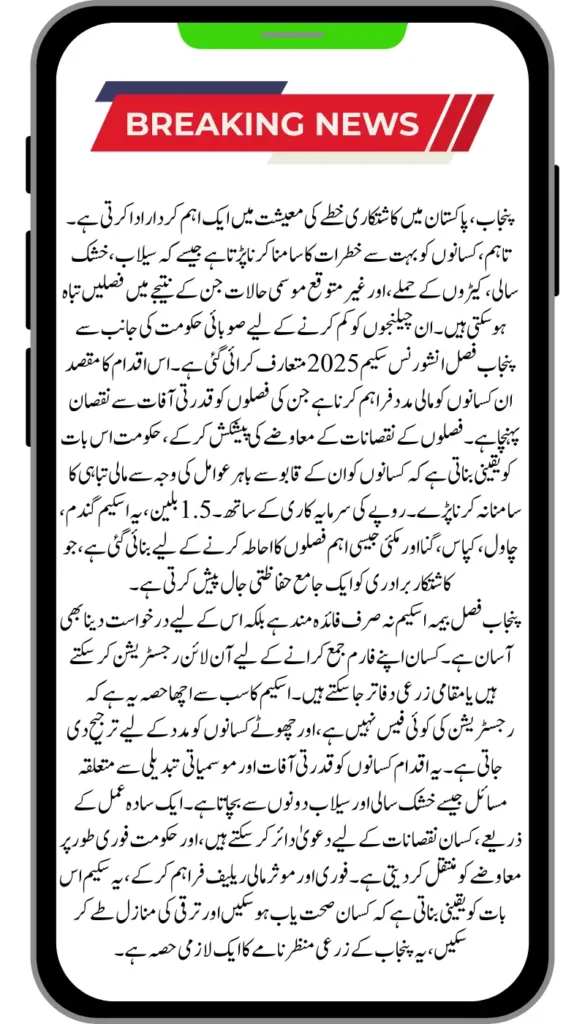 Farming in Punjab, Pakistan, is an essential part of life and the backbone of the economy. However, the risks that farmers face are numerous, ranging from unpredictable weather patterns like floods and droughts to pest infestations and diseases. These challenges can devastate a farmer’s livelihood, leaving them financially ruined. Fortunately, the Punjab government has launched a crucial initiative to safeguard farmers against these risks—the Punjab Crop Insurance Scheme 2025. This scheme provides a safety net for farmers by offering financial compensation in case of crop losses due to natural disasters or pest attacks.