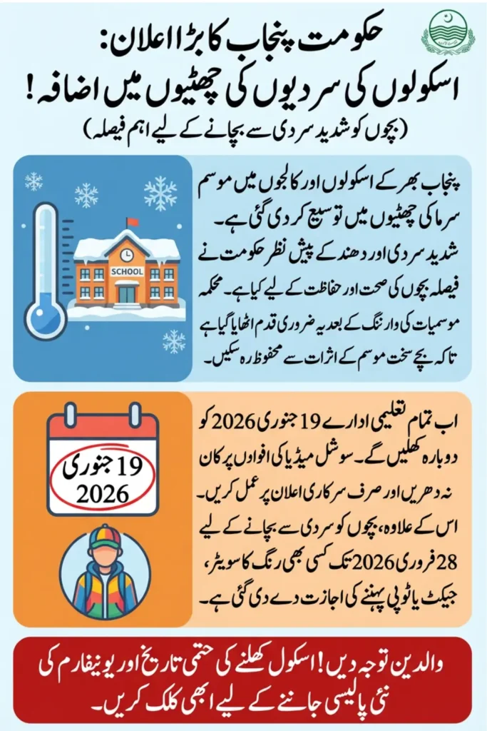 The Punjab government has announced the extension of winter vacations for schools and colleges across the province. The decision aims to protect students from severe cold and harsh weather conditions. Authorities acted following advice from the Provincial Disaster Management Authority (PDMA), which warned of unusually low temperatures in many areas of Punjab.