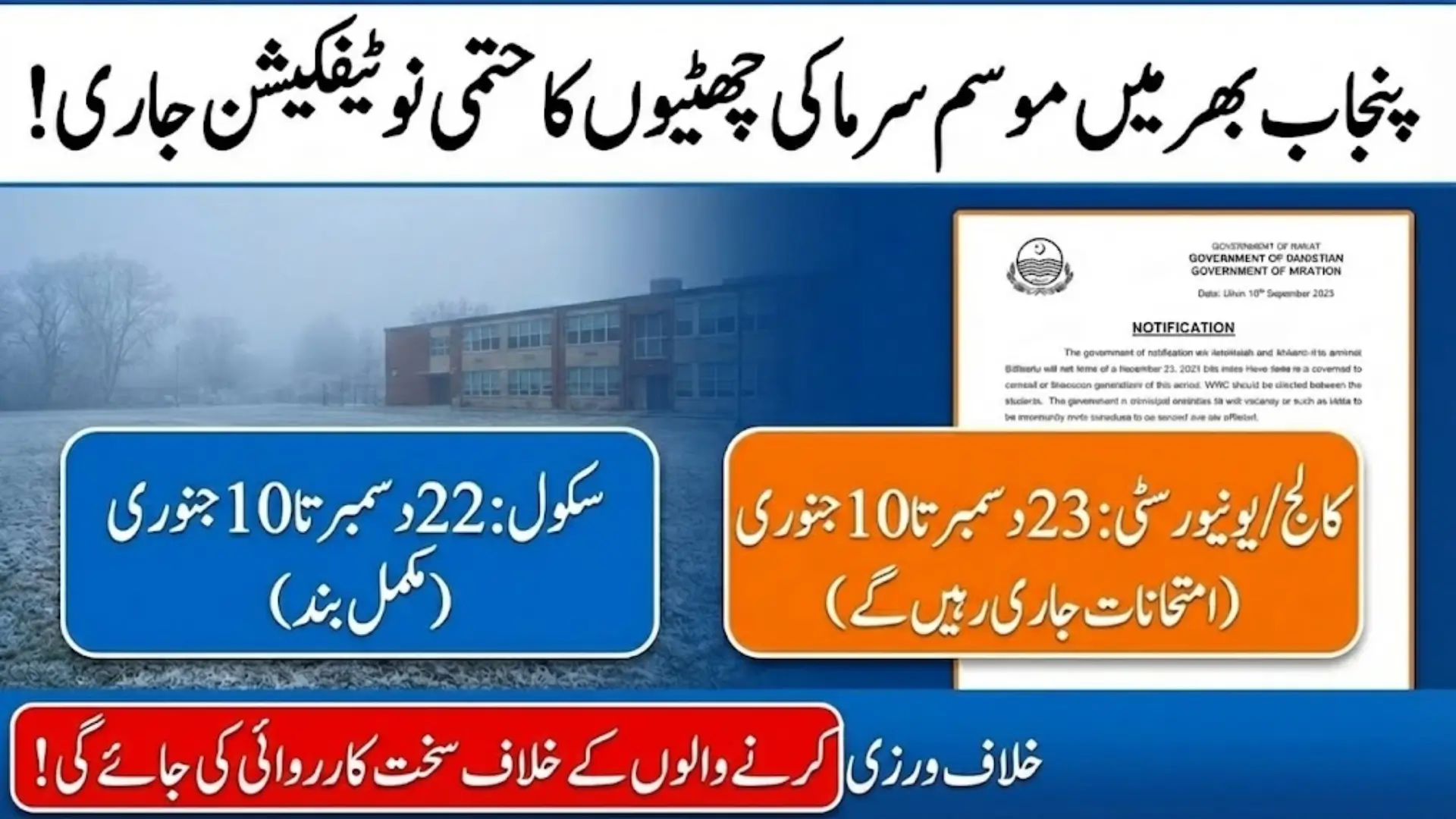 The Punjab School Education Department announced winter vacations separately for schools. Both public and private schools will observe holidays from December 22, 2025, to January 10, 2026. Schools will reopen immediately after the break without any transition period.