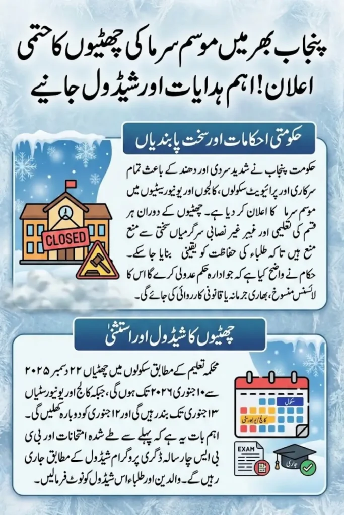 The Punjab government has officially announced winter vacations for schools, colleges, and universities across the province to address seasonal weather challenges. The decision applies to both public and private institutions and aims to ensure student safety during cold temperatures and dense fog conditions. Authorities have emphasized that these holidays are mandatory and must be strictly observed.