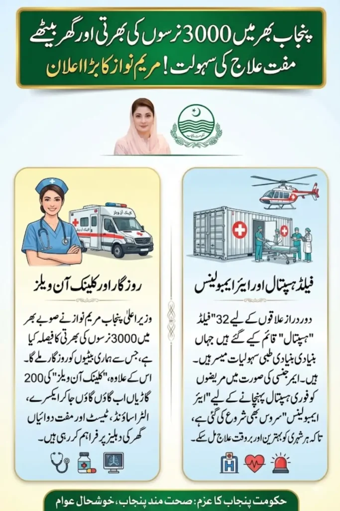 Chief Minister Punjab, Ms Maryam Nawaz, has decided to recruit 3000 Nurses Across Punjab hospitals. She has also issued regular notifications in this regard. Under this project, girls from all over Punjab are provided with the best employment opportunities. Maryam Nawaz said that the purpose of appointing nurses from across the province is to provide maximum facilities in hospitals.