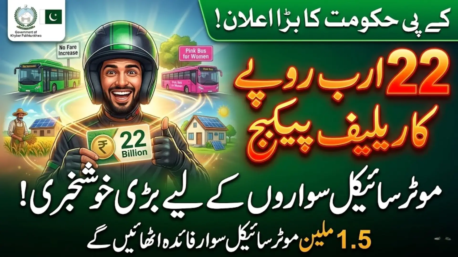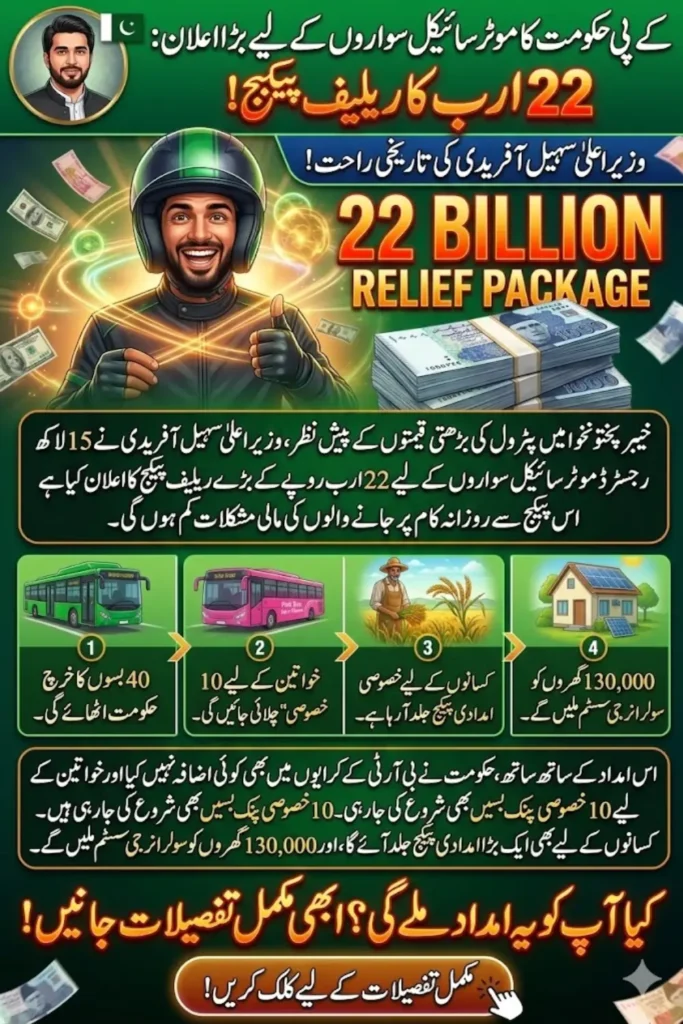 The most important part of the announcement is the Rs 22 billion relief package for motorcycle users. According to Chief Minister Sohail Afridi, the provincial government will provide financial assistance to approximately 1.5 million registered motorcyclists across Khyber Pakhtunkhwa.