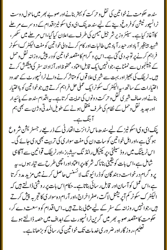 The Government of Sindh has launched the second phase of the Sindh Pink EV Scooties initiative, announced by Senior Minister Sharjeel Memon. This program aims to support women’s mobility by providing free electric scooters along with proper training and licensing assistance. The initiative targets the daily mobility challenges faced by students and working women, especially in urban areas where transport options are limited. The government considers this scheme an important step toward safer, more accessible, and dependable travel for women across the province.
