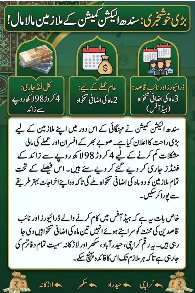 The Election Commission of Sindh has approved the release of additional salaries for its officers and employees across the province. This decision covers two months of extra pay and reflects the institution’s effort to support its workforce during rising financial pressures.