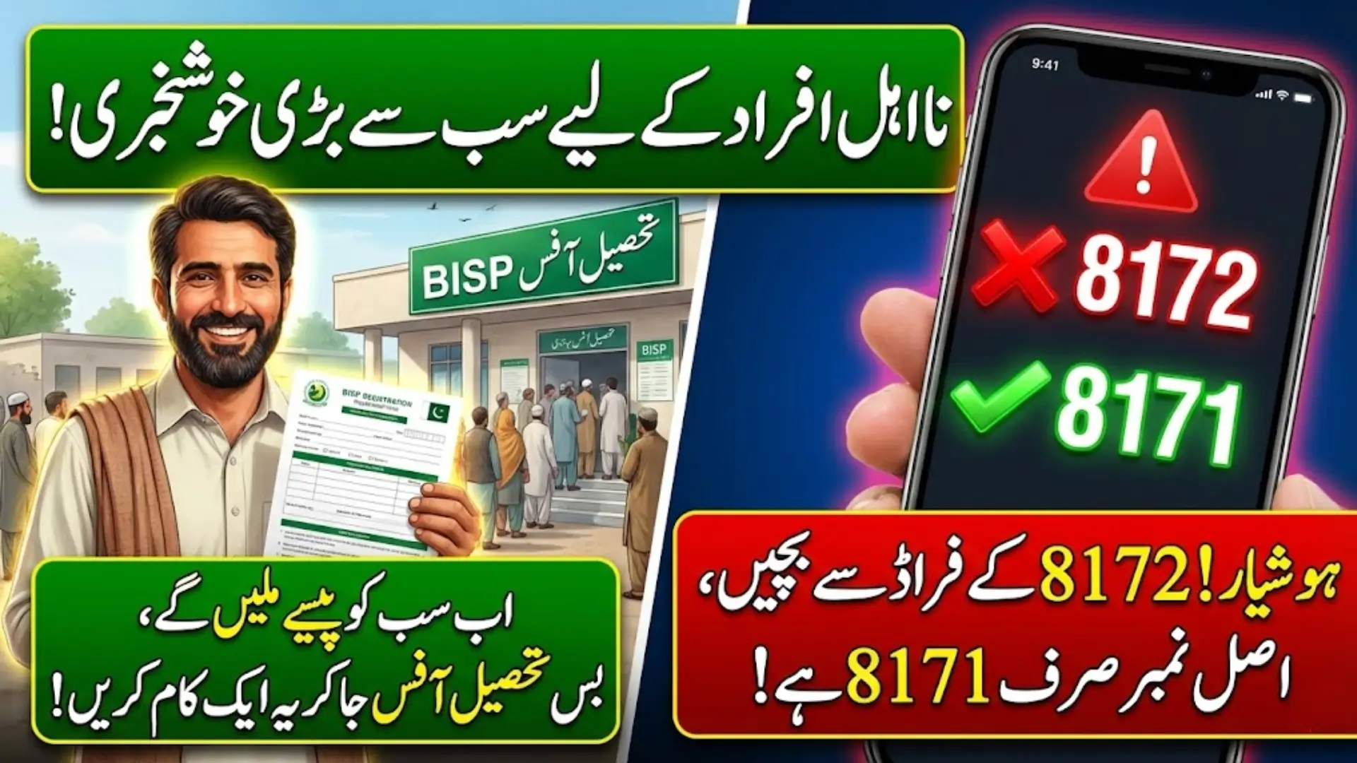 بی ائی ایس پی پروگرام میں غلط معلومات کی فرام اسے گریز کریں کیونکہ جو افراد غلط معلومات فراہم کرتے ہیں یہ ادائیگی سے محروم رہ جاتے ہیں۔ بی ائی ایس پی پروگرام کے اصل ہیلپ لائن نمبر پر اپنا شناختی کارڈ نمبر سینڈ کریں ۔ حکومت کی جانب سے ہیلپ لائن 8171 ہے ۔ 8172 ایک غلط ہیلپ لائن ہے جو معلومات کو ٹریک کرنے کے لیے استعمال کیا جاتا ہے ۔ دوسروں کی معلومات ہے حاصل کرنے کے لیے کئی چال بازی اس کوڈ کا استعمال کرتے ہیں ۔ اس کوڈ سے ایس ایم ایس موصول ہونے پر کوئی جواب نہ دیں۔