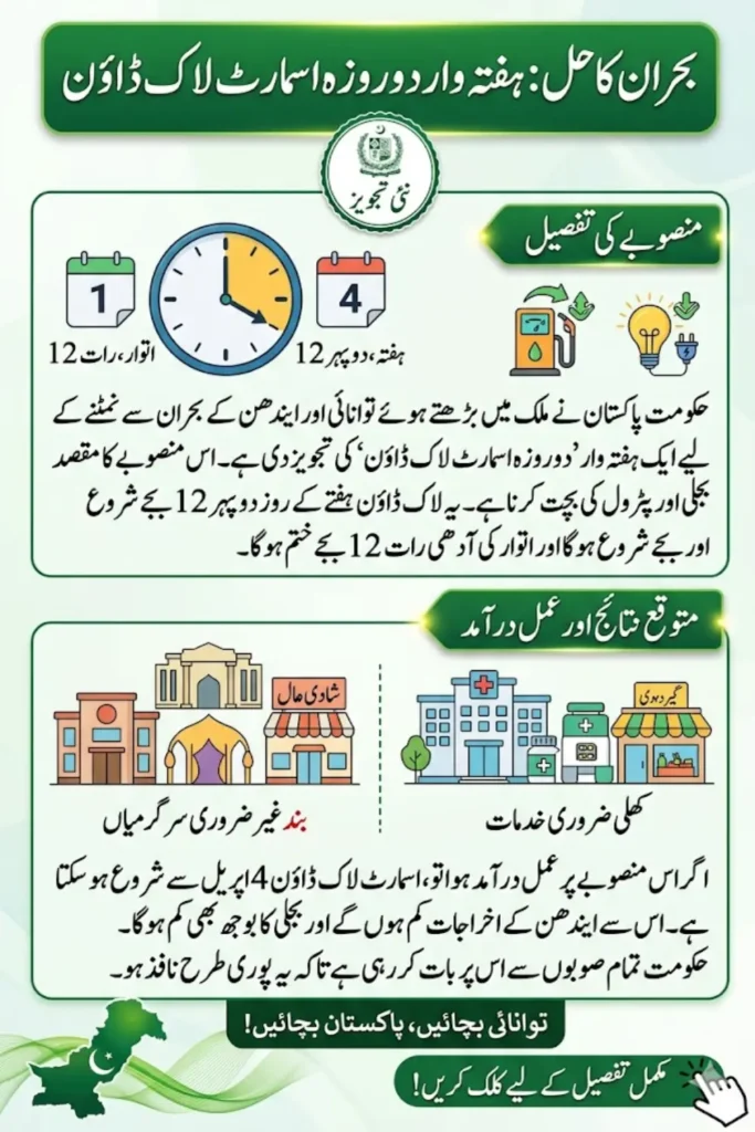 The federal government has introduced a two-day smart lockdown proposal aimed at tackling the growing energy and fuel crisis in Pakistan. With rising fuel costs and increasing pressure on electricity resources, this initiative is designed to reduce unnecessary consumption while maintaining essential activities. The plan reflects a strategic effort to manage resources more efficiently without enforcing a full-scale shutdown.