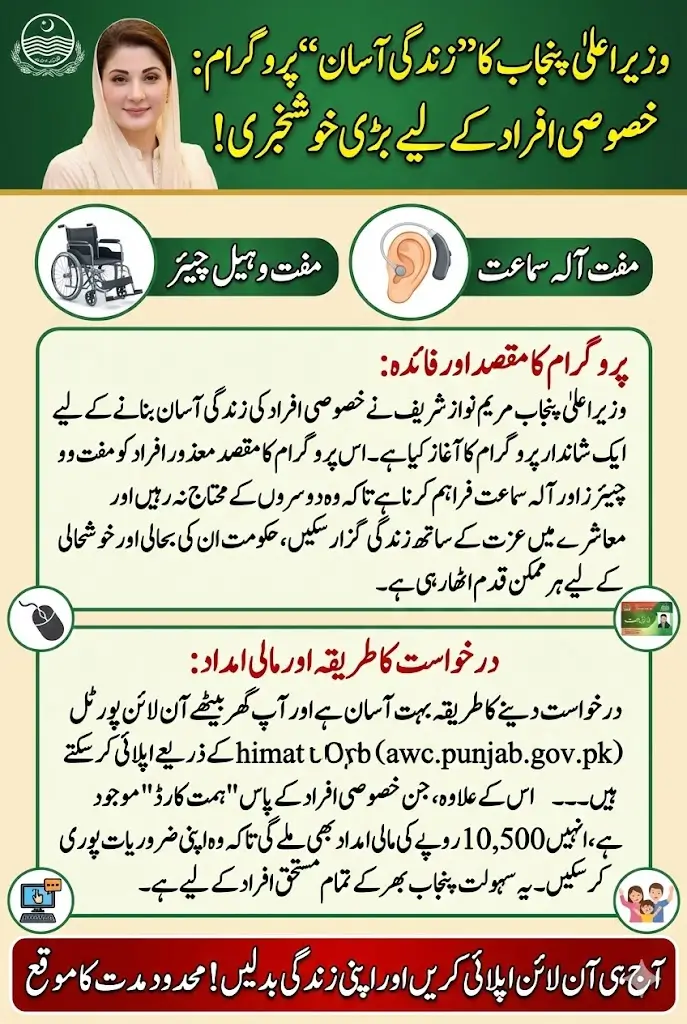Good News: Chief Minister of Punjab Maryam Nawaz has announced the launch of the Zindagi Asaan Program for special persons, under which assistive devices will be provided to special persons to make their lives easier. Under this program, special persons will be able to get wheelchairs and hearing aids, which will not only facilitate their mobility but also improve their hearing. The aim of this program is that people with disabilities can participate fully in social life and not be dependent on other people.
